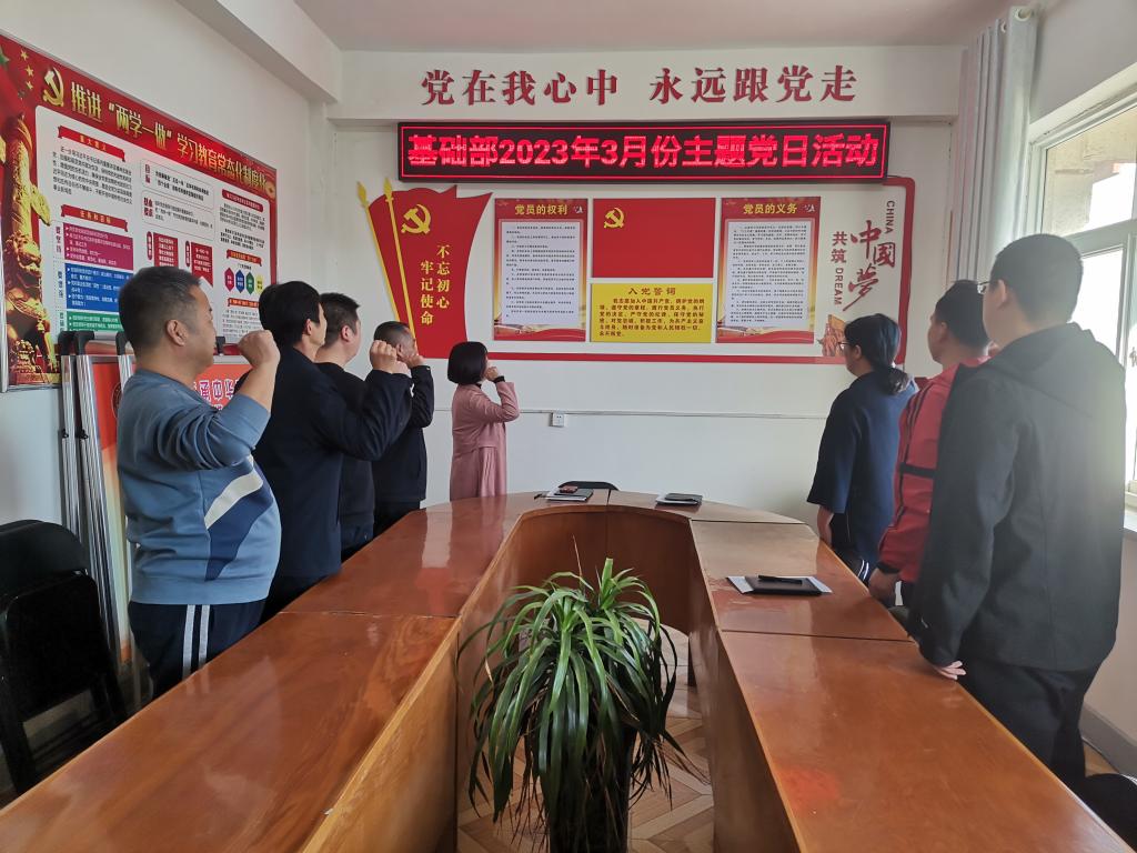 3月14日,yl23411基础部党支部召开2023年3月份主题党日活动,重温入党誓词,进行专题学习,布置相关工作。基础部党支部书记朱献周主持会议,全体党员参加会议。